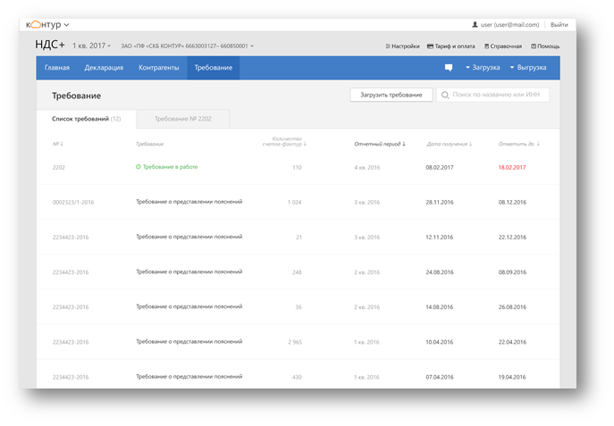Когда вы видите, что в Контур.Экстерн вам пришло требование, вам достаточно его открыть. После этого оно автоматически появится в Контур.НДС+. Если требований несколько, они будут показаны в виде списка — выберите нужное и подготовьте ответ.