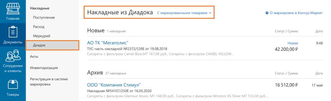 1. Оптовик поставляет магазину маркированные сигареты и немаркированные спички, жвачку, снеки, хлебцы, шоколад. Все эти товары указаны в одном УПД, отправленном через Контур.Диадок. Магазин в Маркете получает этот УПД и может сразу принять все товары по единому документу.