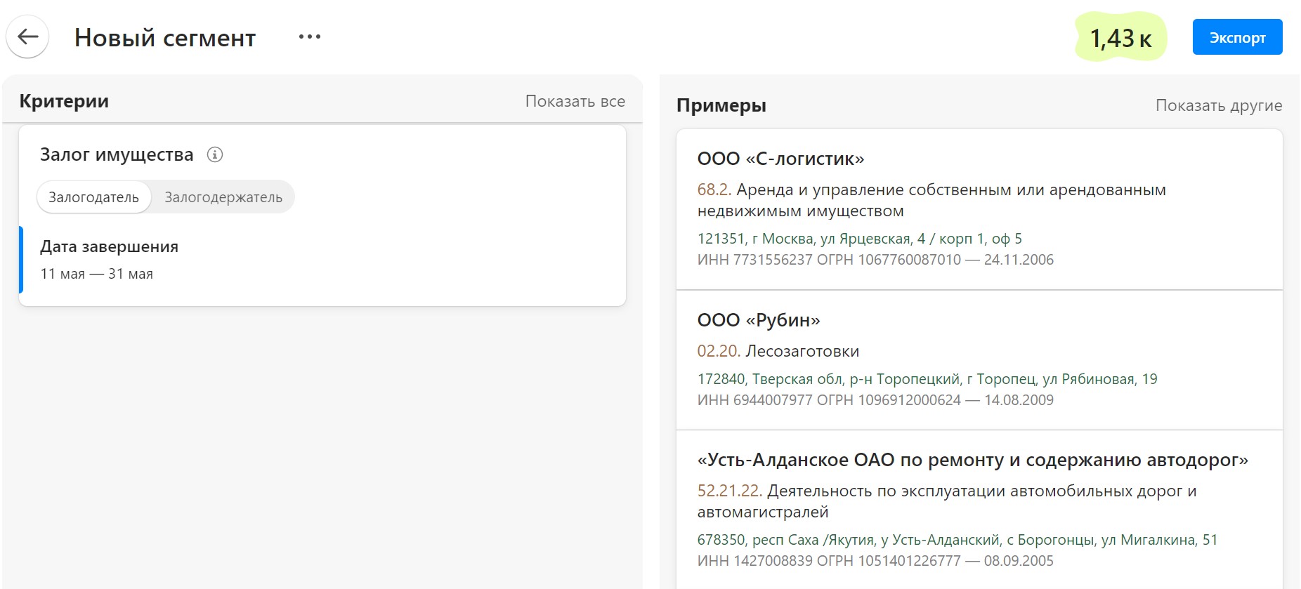 Вот пример —найдем предприятия, у которых договоры залога истекают после майских праздников. Это 1400 ИП и юрлиц:
