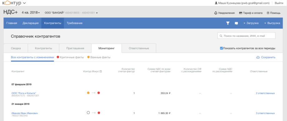 Модуль Контур.Экстерна НДС+ помогает снизить риски на всех этапах работы с НДС: проверить добросовестность контрагентов, устранить ошибки и расхождения в данных, составить декларацию, получая советы экспертов, оперативно ответить на требование налоговой о пояснениях.