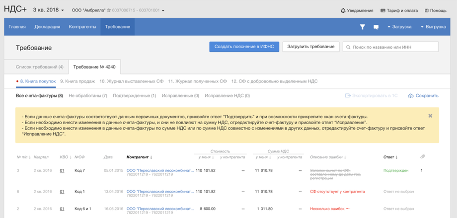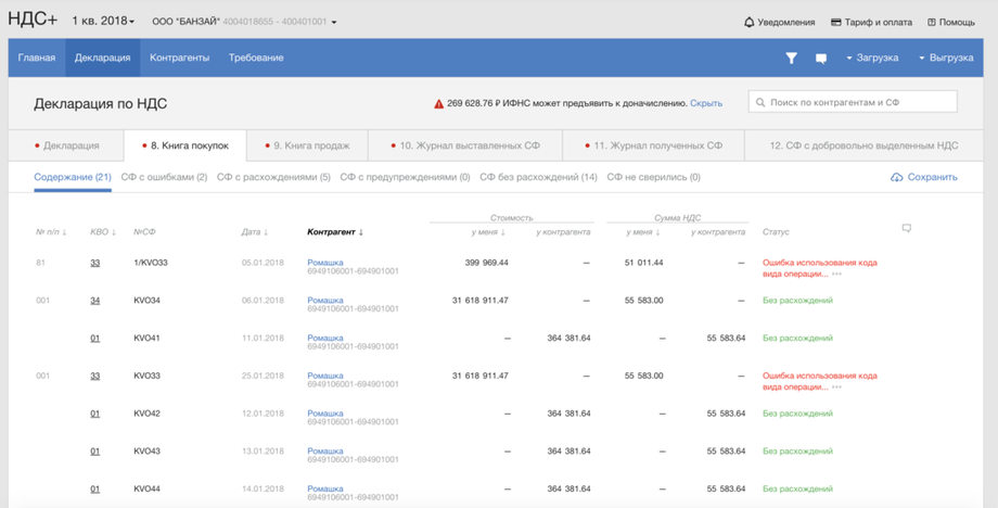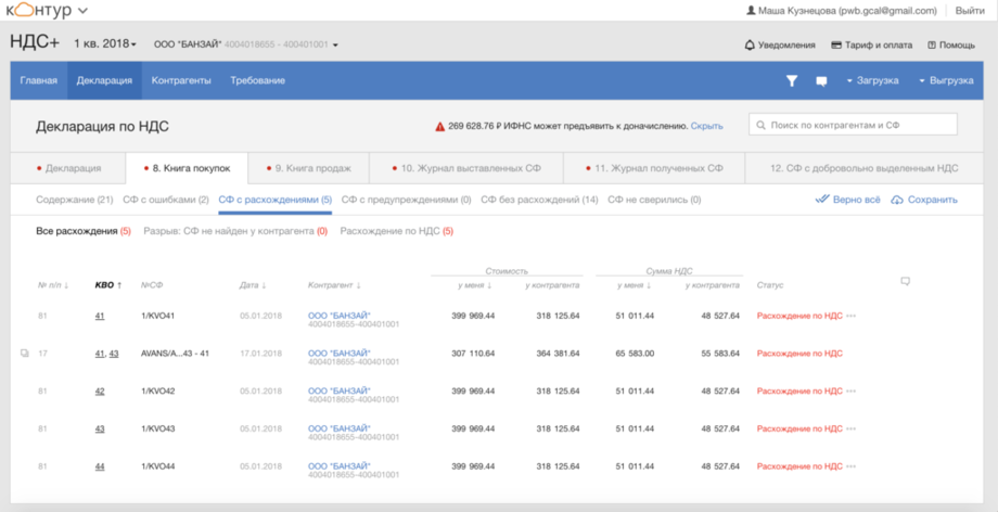 Контур.НДС+ обнаружит несоответствия в реквизитах контрагентов, расхождения по суммам, датам и номерам счетов-фактур. Сдавайте в ФНС правильные декларации и снижайте количество требований.
